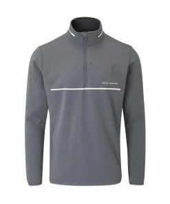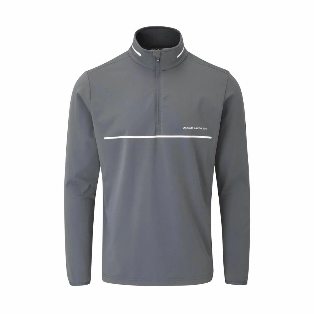 The DARWIN quarter zip neck top is a technical performance mid layer blending contemporary styling with an exclusively designed functional soft touch stretch fabric. The lightweight four way stretch fabrication offers the modern golfer unrivalled freedom of movement and exceptional breathability. The established Oscar Jacobson contemporary soft handle, construction and durability of the bespoke fabric offers ultimate comfort and enhanced playing experience. The quarter zip neck featuring a water resistant zipper, binding cuffs for secured fit, dropped hem and a striking front chest printed stripe all enhance the brands commitment to detail, quality and performance.
