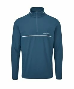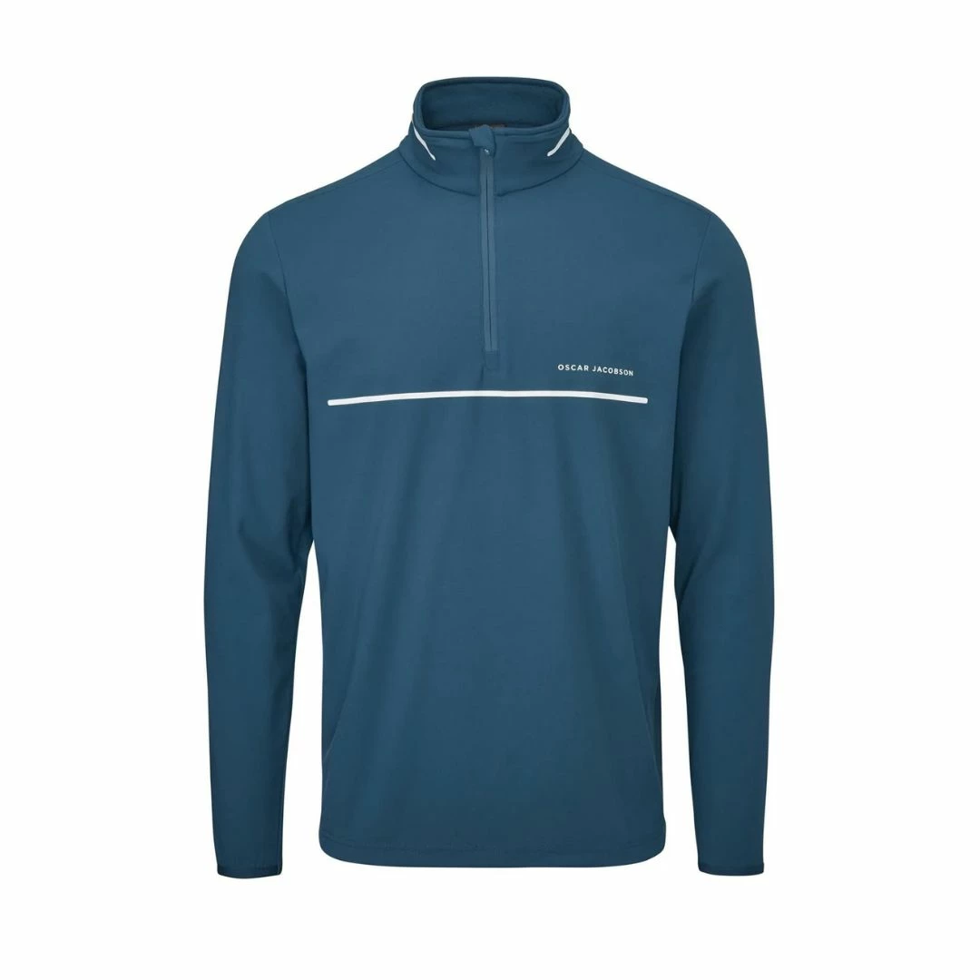 The DARWIN quarter zip neck top is a technical performance mid layer blending contemporary styling with an exclusively designed functional soft touch stretch fabric. The lightweight four way stretch fabrication offers the modern golfer unrivalled freedom of movement and exceptional breathability. The established Oscar Jacobson contemporary soft handle, construction and durability of the bespoke fabric offers ultimate comfort and enhanced playing experience. The quarter zip neck featuring a water resistant zipper, binding cuffs for secured fit, dropped hem and a striking front chest printed stripe all enhance the brands commitment to detail, quality and performance.
